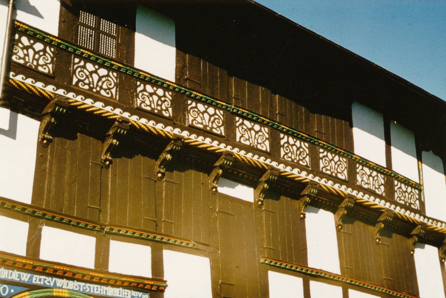 Ein Haus aber, näher schon dem Wall, am Langen Steinweg, ist reicher an Fenstern und kostbarer Arbeit des Gebälks denn alle – es sei denn an des Herzogs Julius Hoflager gedacht – das wie ein einziges Holzrelief ist. Herrlich bunt sind alle Leisten. Läden, Flächen, Simse, Stabfassungen, die Fensterbögen und die Rundungen der beiden mächtigen Türen an dem Haus im Langen Steinweg. Aber seine Läden sind geschlossen; Balken sind vor die Tore dieses vielleicht reichsten Hauses einer armen Stadt gelegt, das heute noch den Namen seiner Besitzerin, ganz gewiß einer Herrin, in seine Balken eingeschnitzt trägt: Margarete Friderich. Und der Totenernst, der über diese bunte, wirre Stadt gelagert ist, spricht am erschütterndsten aus den Lettern, die jene Unbekannte ihrem vielleicht geneideten, vom Glück wahrscheinlich nie durchwärmten Hause einmeißeln ließ: "Weil mir die Welt zuwider ist, Steh mir bei, Herr Jesu Christ."